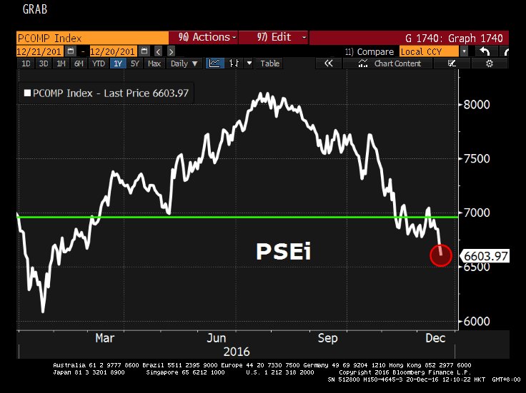 Unless Philippine stocks rally 6% in the next few days, we'll see the first annual loss in 7 years. Stock index at 6,600 level