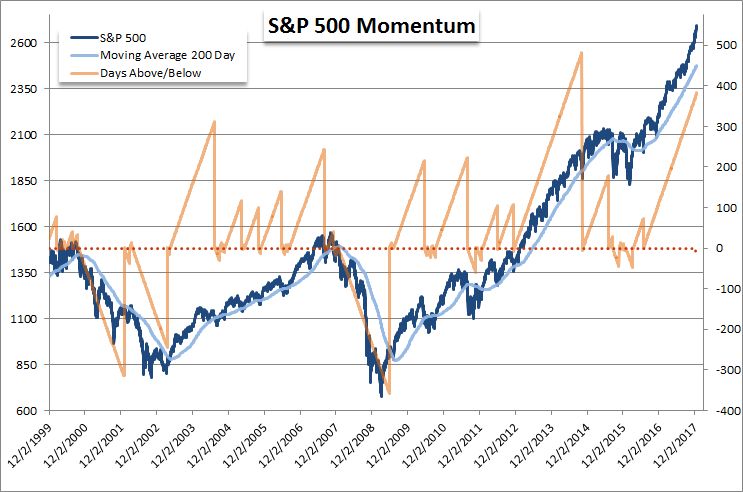 Here is a chart showing how many consecutive days the S&P 500 has spent above or below its 200-day simple moving average since 2000
