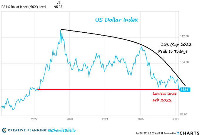 The US Dollar Index is at its lowest level in 4 years, down 16% from its peak in September 2022.