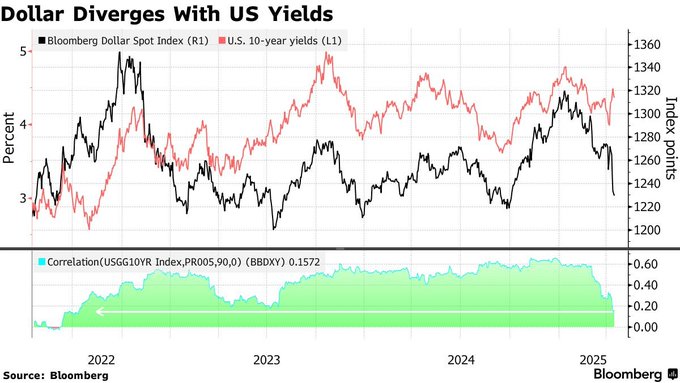 The dollar is dropping as yields rise, an unusual divergence that is due in part to foreign fund outflows
