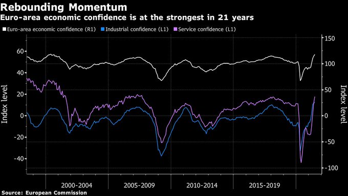 Confidence in the euro-area economy rises to the highest