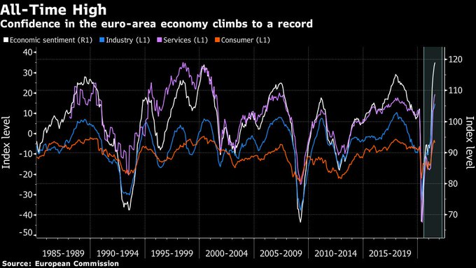 Confidence in the euro-area economy climbs to a record as business resurges following the end of coronavirus lockdowns