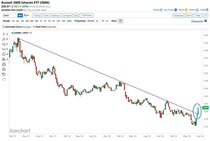 Small Cap Stocks IWM have finally broken through the 3.5 year trendline against the S&P 500 SPY