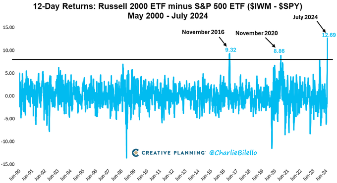 US Small Caps are up 10% over the last 12 trading days while US Large Caps are down 3%. The 13% spread is the largest 12-day Small Cap outperformance ever