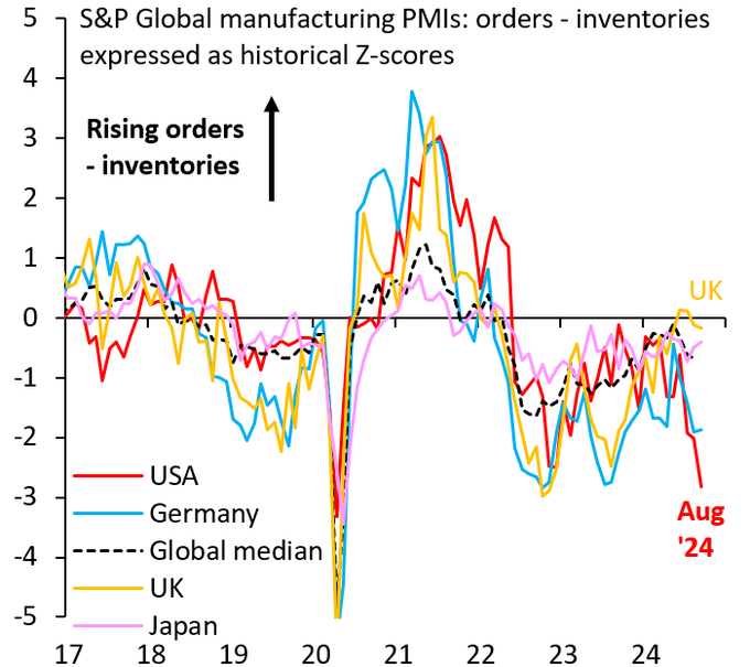 Global recession risk is rising sharply. The forward-looking orders - inventories component in the S&P Global manufacturing PMIs is going negative all over the place. For the US (red), it just fell to a more negative level than in late 2022 right after Russia invaded Ukraine...