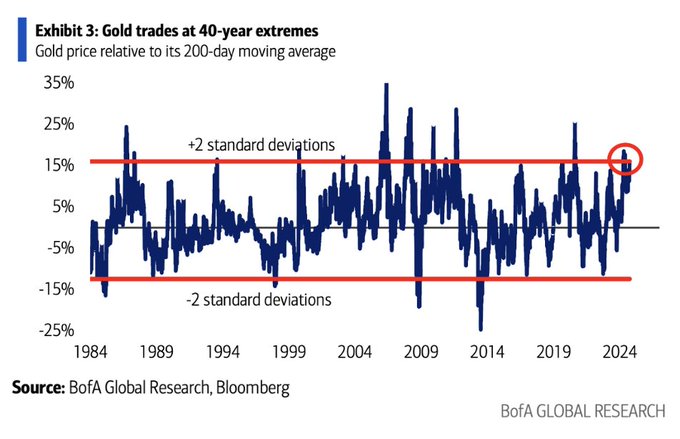 Gold now trading at 40-year extremes relative to its 200D moving average