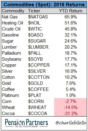 With 1 trading day left, commodities (CRB Index) on pace for their first positive yr since 2010. YTD returns...