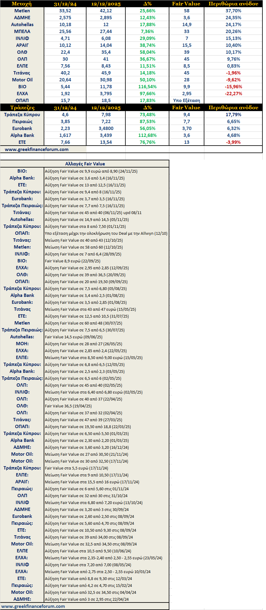 Τα Fair Value, οι αποδόσεις του 2025 και τα περιθώρια ανόδου upd - upd