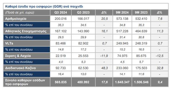 καθαρά έσοδα προ εισφορών (GGR) του 9μηνου διαμορφώθηκαν στα