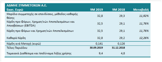 ΑΔΜΗΕ Συμμετοχών: Στα 19,9εκατ. τα κέρδη α' εξαμήνου Στα 126 εκατ. ευρώ, αυξημένα κατά 1% σε σχέση με το α' εξάμηνο του περασμένου έτους, διαμορφώθηκαν τα έσοδα της ΑΔΜΗΕ ΑΕ το α' εξάμηνο του 2019, με τα καθαρά κέρδη να διαμορφώνονται στα 39,4 εκατομμύρια ευρώ (μειωμένα κατά 11,4%) και τα προσαρμοσμένα καθαρά κέρδη στα 38,2 εκατ. ευρώ, αυξημένα κατά 7% σε σχέση με το αντίστοιχο εξάμηνο του 2018.Σύμφωνα με τα όσα αναφέρει η εταιρεία στην ανακοίνωση της, η ΑΔΜΗΕ Συμμετοχών, κάτοχος του 51% των μετοχών της ΑΔΜΗΕ Α.Ε., ανακοίνωσε καθαρά κέρδη 19,9 εκατ. ευρώ και απόφαση καταβολής μερίσματος και προμερίσματος 0,088 ευρώ ανά μετοχή.Όπως αναφέρεται στη σχετική ανακοίνωση, "τα Λειτουργικά Έξοδα κατά το Α’ εξάμηνο ανέρχονται στις 175 χιλιάδες ευρώ και αντανακλούν δαπάνες που συνδέονται κυρίως με τη διαπραγμάτευση στο Χρηματιστήριο Αθηνών και τις Αμοιβές Προσωπικού. Ως αποτέλεσμα της ενεργής διαχείρισης των ταμειακών διαθεσίμων τα χρηματοοικονομικά έσοδα ανήλθαν στις 172 χιλιάδες ευρώ και αντιστάθμισαν μέρος των Λειτουργικών Εξόδων της εταιρείας.Τα Καθαρά Κέρδη της ΑΔΜΗΕ Συμμετοχών Α.Ε. ανήλθαν σε 19,9 εκατ. ευρώ και τα κέρδη ανά μετοχή διαμορφώθηκαν σε 0,086 ευρώ.Τα Ταμειακά Διαθέσιμα της εταιρείας στις 30 Ιουνίου 2018 ανέρχονταν στα 26,6 εκατ. ευρώ. Το ποσό αυτό έχει τοποθετηθεί στην Τράπεζα της Ελλάδος που προσφέρει μέσο επιτόκιο 2,76%. Η ΑΔΜΗΕ Συμμετοχών Α.Ε. δεν έχει χρέος.Για το 2019, η Διοίκηση πρότεινε τη διανομή του μέγιστου επιτρεπόμενου ποσοστού, ήτοι το 50% του μερίσματος που έλαβε από την ΑΔΜΗΕ Α.Ε. μέσα στο έτος, ως προμέρισμα. Το προμέρισμα ανά μετοχή προς διανομή ανήλθε στα 0,06 ευρώ και διανεμήθηκε στους μετόχους τον Αύγουστο. Επίσης μετά από απόφαση της τακτικής γενικής συνέλευσης που έλαβε χώρα στις 04.07.2019 αποφασίστηκε η διανομή του εναπομείναντος μερίσματος 0,0284 ευρώ ανά μετοχή για τη χρήση 2018, διανεμηθέν τον Αύγουστο μαζί με το προμέρισμα του 2019. Συνεπώς οι μέτοχοι έλαβαν συνολικό ποσό μερίσματος 0,088 ευρώ ανά μετοχή.Όσον αφορά στις προοπτικές, η ΑΔΜΗΕ Συμμετοχών, στην ανακοίνωσή της, αναφέρει ότι "η ΑΔΜΗΕ Α.Ε. στο πλαίσιο της χάραξης νέων στρατηγικών αναχρηματοδότησης έχει εξασφαλίσει τα απαραίτητα κεφάλαια που απαιτούνται για την κάλυψη των επιχειρησιακών και επενδυτικών αναγκών της για τα επόμενα χρόνια. Διαθέτει δε ένα πλήρως διαφοροποιημένο χαρτοφυλάκιο δανείων, το οποίο σε συνδυασμό με την ενεργή διαχείριση ταμειακών διαθεσίμων ενισχύει το χρηματοοικονομικό προφίλ της ώστε να εφαρμόσει από θέση ισχύος το φιλόδοξο επενδυτικό της πρόγραμμα.Ο εξορθολογισμός των λειτουργικών και χρηματοδοτικών δαπανών αποτελεί μια από τις βασικές προτεραιότητες των δυο τελευταίων ετών. Σε αυτό το πλαίσιο έχουν υλοποιηθεί προγράμματα οικειοθελούς αποχώρησης, καθώς και αναχρηματοδότηση του υπάρχοντος δανεισμού, αλλά και νέα χρηματοδότηση με ευνοϊκότερους όρους.Το όφελος από το Πρόγραμμα Οικειοθελούς Αποχώρησης του 2018 υπολογίζεται σε περίπου 8,8 εκ. ευρώ σε ετήσια βάση, ενώ το όφελος από το Πρόγραμμα Οικειοθελούς Αποχώρησης του 2019 υπολογίζεται σε περίπου 5,4 εκ. ευρώ σε ετήσια βάση. Το συνολικό όφελος για την Εταιρία, το οποίο θα αποτυπώνεται σταδιακά στα αποτελέσματα των επόμενων χρήσεων, θα φτάσει αθροιστικά τα περίπου 14 εκ. ευρώ σε ετήσια βάση, μη λαμβάνοντας υπόψη το κόστος μισθοδοσίας των νέων υπαλλήλων που θα προσληφθούν, το οποίο θα είναι ωστόσο μειωμένο.Σε ό,τι αφορά τα χ