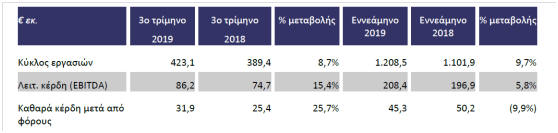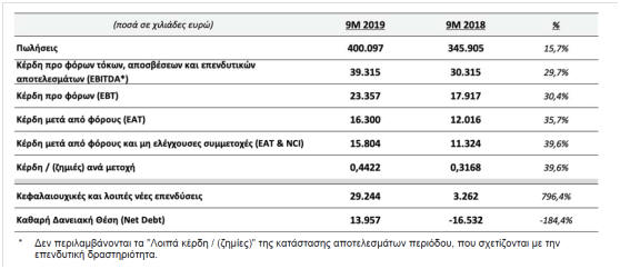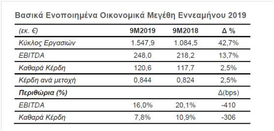 Σύμφωνα με τα όσα αναφέρει η εταιρεία στην ανακοίνωση της, στο εννεάμηνο του 2019 η ΜΥΤΙΛΗΝΑΙΟΣ Α.Ε. (RIC: MYTr.AT, Bloomberg: MYTIL.GA, ADR: MYTHY US) συνεχίζει να καταγράφει επιδόσεις αντίστοιχα υψηλές με αυτές του Α΄ εξαμήνου. Σε ενοποιημένη βάση: • O Κύκλος εργασιών ανήλθε σε €1.547,9 εκατ., έναντι €1.084,5 εκατ. την αντίστοιχη περίοδο του 2018, σημειώνοντας αύξηση 42,7%. • Τα Λειτουργικά κέρδη προ φόρων, τόκων και αποσβέσεων (EBITDA), διαμορφώθηκαν σε €248,0 εκατ. έναντι €218,2 εκατ. την αντίστοιχη περίοδο του 2018, παρουσιάζοντας αύξηση 13,7%. • Τα Καθαρά κέρδη, μετά από φόρους και δικαιώματα μειοψηφίας, διαμορφώθηκαν σε €120,6 εκατ. έναντι €117,7 εκατ. την αντίστοιχη περίοδο του 2018, καταγράφοντας αύξηση 2,5%. • Αντίστοιχα τα Κέρδη ανά Μετοχή ανήλθαν σε €0,844 έναντι €0,824 την αντίστοιχη περίοδο του 2018. • Ο καθαρός δανεισμός διαμορφώθηκε στα €449 εκατ.