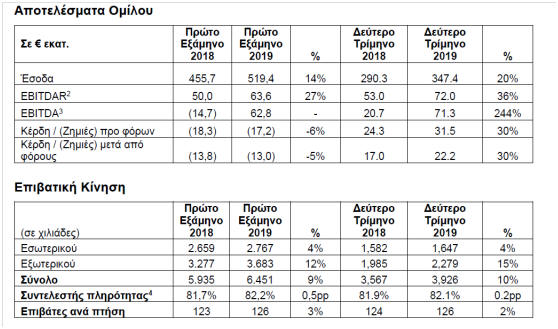 Aegean Airlines: Στο +30% η κερδοφορία στο 6μηνο Σύμφωνα με τα όσα αναφέρει η εταιρεία σε ανακοίνωση της ….Η AEGEAN ανακοινώνει τα οικονομικά αποτελέσματα του Πρώτου Εξαμήνου 2019, καταγράφοντας αύξηση 14% στον ενοποιημένο κύκλο εργασιών, που ανήλθε σε €519,4 εκ., και βελτίωση του καθαρού αποτελέσματος μετά από φόρους, το οποίο διαμορφώθηκε σε ζημίες ύψους €13,0 εκ. από €13,8 εκ. το αντίστοιχο εξάμηνο του 2018, μετά και την πρώτη εφαρμογή του λογιστικού προτύπου IFRS 16. H πρώτη εφαρμογή επιβάρυνε το αποτέλεσμα κατά €3,8 εκ. συνεπώς σε συγκρίσιμη βάση οι καθαρές ζημιές του πρώτου εξαμήνου 2019 θα ήταν €9,2 εκ. από €13,8 εκ. το 2018.Η συνδρομή του δεύτερου τριμήνου ήταν καθοριστική στη διαμόρφωση του αποτελέσματος, με τον Όμιλο να προσφέρει 12% περισσότερες χιλιομετρικές θέσεις, επιλέγοντας στρατηγικά την προσπάθεια επιμήκυνσης της τουριστικής περιόδου. Πέτυχε συνεπώς 10% αύξηση της συνολικής επιβατικής κίνησης, κυρίως λόγω της αύξησης της κίνησης εξωτερικού κατά 15%, που αποτελεί και ρυθμό ανάπτυξης σημαντικά υψηλότερο από το σύνολο των αεροπορικών αφίξεων προς τη χώρα. Αντίστοιχα, κατά το δεύτερο τρίμηνο κατέγραψε 20% αύξηση των ενοποιημένων εσόδων και 30% αύξηση του καθαρού αποτελέσματος μετά από φόρους, που ανήλθε σε κέρδη ύψους €22,2 εκ. από €17 εκ. το δεύτερο τρίμηνο του 2018.Στο σύνολο του πρώτου εξαμήνου του έτους, ο Όμιλος πέτυχε αύξηση της επιβατικής κίνησης κατά 9%, μεταφέροντας 6,5 εκ. επιβάτες. Στο δίκτυο εσωτερικού ταξίδεψαν 2,8 εκ. επιβάτες, 4% περισσότεροι σε σχέση με το 2018. Στο δίκτυο εξωτερικού, που αντιπροσωπεύει και το 76% του κύκλου εργασιών, η επιβατική κίνηση αυξήθηκε κατά 12% σε 3,7 εκ. επιβάτες. H μέση πληρότητα πτήσεων βελτιώθηκε περαιτέρω σε 82,2% από 81,7%.Tα ταμειακά διαθέσιμα και ισοδύναμα διαμορφώθηκαν σε €602,3 εκ.1 την 30.06.2019 ενώ το σύνολο των δανείων ανήλθε σε €200 εκ. μετα την έκδοση του επταετούς ομολόγου.Ο κ. Δημήτρης Γερογιάννης, Διευθύνων Σύμβουλος, ανέφερε σχετικά:«Συνεχίσαμε με συνέπεια την αναπτυξιακή μας πορεία προσθέτοντας σημαντική επιπλέον χωρητικότητα στις γραμμές εξωτερικού. Η προσπάθεια μας για επέκταση της τουριστικής περιόδου κυρίως το διάστημα Απριλίου – Μαΐου και η καλύτερη αξιοποίηση του στόλου μας συνέβαλε σε θετικά αποτελέσματα, παρά τη συγκρατημένη δυναμική του εισερχομένου τουρισμού. Άλλωστε, η άμβλυνση της εποχικότητας θεωρείται μείζων στόχος τόσο για τον ελληνικό τουρισμό όσο και για την AEGEAN. 2Η εξέλιξη των πληροτήτων και του κύκλου εργασιών της εταιρείας μας από την κίνηση του εξωτερικού και κατά το τρίτο και πιο σημαντικό τρίμηνο που διαχρονικά διαμορφώνει το ετήσιο αποτέλεσμα, δείχνουν ικανοποιητικές, παρά την οριακή αύξηση των συνολικών αφίξεων της αγοράς αερομεταφορών στη χώρα μας.Ταυτόχρονα συνεχίζουμε την προετοιμασία για την ένταξη των νέων αεροσκαφών στον στόλο μας το 2020».Το Μάρτιο του 2019 η Εταιρεία ολοκλήρωσε με επιτυχία την έκδοση ΚΟΔ ύψους €200 εκ. επταετούς διάρκειας με κουπόνι 3,60%.