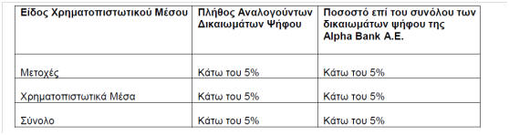 Alpha Bank – Κάτω από το 5% το ποσοστό της BlackRock Η Alpha Bank A.E. (η «Τράπεζα») ενημερώνει, κατ’ εφαρμογή του Ν. 3556/2007, ότι η BlackRock, Inc., κατόπιν της από 16.9.2019 σχετικής γνωστοποιήσεώς της, κατέχει έμμεσα από την 13.9.2019 δικαιώματα ψήφου τα οποία αντιστοιχούν σε ισάριθμες κοινές, ονομαστικές, μετά ψήφου, άυλες μετοχές, καθώς και άλλα χρηματοπιστωτικά μέσα τα οποία παρέχουν δικαίωμα αποκτήσεως μετοχών που ενσωματώνουν δικαιώματα ψήφου, σε ποσοστό κάτω του ορίου του 5% επί του συνόλου των δικαιωμάτων ψήφου της Τραπέζης.