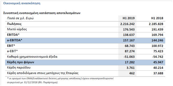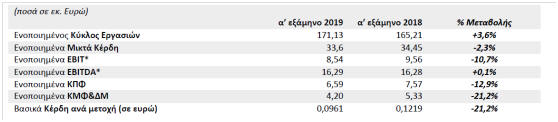 Σκοπός του παρόντος είναι να παρουσιάσει τα οικονομικά αποτελέσματα του Ομίλου για το α’ εξάμηνο του 2019 και να επισημάνει τους βασικούς παράγοντες οι οποίοι συνέβαλαν στη διαμόρφωσή τους. Τα βασικά χαρακτηριστικά της περιόδου συνοψίζονται ως εξής: • Αύξηση του ενοποιημένου κύκλου εργασιών κατά 3,6% και οριακή αύξηση του όγκου των ενοποιημένων πωλήσεων κατά 0,4%, η οποία οφείλεται στον Κλάδο της Συσκευασίας. • Μειωμένη ζήτηση στον κλάδο των γεωσυνθετικών στην αγορά των Η.Π.Α. καθώς και στην αγορά του carpet backing λόγω της πτωτικής τάσης της αγοράς και της σημαντικής αύξησης του ανταγωνισμού από χώρες χαμηλού κόστους. • Η εν λόγω μείωση αντισταθμίζεται σε ένα βαθμό από την αύξηση του όγκου πωλήσεων των Ελληνικών θυγατρικών κυρίως στον κλάδο της Συσκευασίας αλλά και στον κλάδο των Tεχνικών Yφασμάτων. • Μείωση των Μικτών Κερδών κατά 2,3% και συμπίεση του περιθωρίου κέρδους η οποία οφείλεται στον κλάδο των Τεχνικών Υφασμάτων και ειδικότερα: ▪ Η αβεβαιότητα που δημιουργεί το BREXIT έχει ως απόρροια τη μείωση της ζήτησης για μια σειρά προϊόντων της θυγατρικής της Σκωτίας και κατ’ επέκταση στη συμπίεση των τιμών πώλησης. Η σημαντική αύξηση του ανταγωνισμού από χώρες χαμηλού κόστους (Τουρκία, Σ. Αραβία) στην αγορά του carpet backing είχε ως αποτέλεσμα τη μείωση των πωλήσεων και τη συρρίκνωση των περιθωρίων κέρδους. Τέλος, λόγω των συνθηκών της αγοράς στη Μ. Βρετανία, η μετακύλιση της αύξησης των τιμών των α’ υλών ως απόρροια της ισοτιμίας Ευρώ/ Λίρας Αγγλίας παρέμεινε εξαιρετικά δύσκολη. ▪ Η μείωση της ζήτησης των γεωσυνθετικών στην αγορά των Η.Π.Α συνεχίστηκε και στο α΄ εξάμηνο της τρέχουσας χρήσης με επακόλουθο τη συμπίεση των τιμών πώλησης εν μέσω έντονου ανταγωνισμού. ▪ Η αύξηση των πωλήσεων σε συνδυασμό με τη συγκράτηση του κόστους παραγωγής στις Ελληνικές θυγατρικές του Ομίλου στον κλάδο της Συσκευασίας οδήγησε σε βελτίωση των περιθωρίων κέρδους η οποία αντιστάθμισε εν μέρει την απώλεια του περιθωρίου κέρδους στα Τεχνικά Υφάσματα. • Θετική η επίδραση από τις συναλλαγματικές διαφορές στα αποτελέσματα του Ομίλου, αν και μειωμένη σε σχέση με το α’ εξάμηνο του 2018. Ειδικότερα τα βασικά μεγέθη του Ομίλου για το α’ εξάμηνο της τρέχουσας χρήσεως σε σχέση με το α’ εξάμηνο του 2018 διαμορφώθηκαν ως εξής: