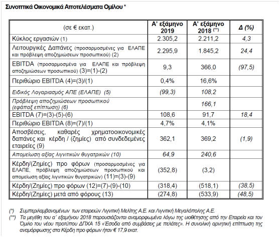 Ελλάκτωρ – Κέρδη μετά φόρων από ζημίες …. Αλλά και πάντα μεγάλο δανεισμό Κέρδη μετά από φόρους ύψους € 5,7 εκατ. σημείωσε ο Όμιλος ΕΛΛΑΚΤΩΡ κατά το πρώτο εξάμηνο του 2019, έναντι ζημιών € 31 εκατ. το πρώτο εξάμηνο του 2018, ενώ σε επίπεδο αποτελεσμάτων προ φόρων ο Όμιλος παρουσίασε κέρδη € 29,4 εκατ. έναντι ζημίας € 11,7 εκατ. για το αντίστοιχο διάστημα πέρυσι. Τα ενοποιημένα κέρδη προ φόρων, χρηματοδοτικών, επενδυτικών αποτελεσμάτων και αποσβέσεων (EBITDA)2 διαμορφώθηκαν για το πρώτο εξάμηνο του 2019 σε € 112,2 εκατ., έναντι των 82,4 εκατ. ευρώ για την αντίστοιχη περίοδο 2018, σημειώνοντας αύξηση 36,2%, ενώ το περιθώριο EBITDA για το πρώτο εξάμηνο του 2019 ήταν 15,9% έναντι 8,9% την αντίστοιχη περίοδο του 2018. Τα αποτελέσματα εκμετάλλευσης (ΕΒΙΤ) παρουσίασαν αύξηση κατά 90,1% και ανήλθαν σε € 61,6 εκατ., έναντι € 32,4 εκατ. για το αντίστοιχο διάστημα του προηγούμενου έτους. Όπως αναμενόταν, ο ενοποιημένος κύκλος εργασιών του Ομίλου, υποχώρησε το πρώτο εξάμηνο του 2019 σε € 705,1 εκατ. έναντι € 922,3 εκατ. την αντίστοιχη περίοδο του 2018, ως αποτέλεσμα της μειωμένης κατασκευαστικής δραστηριότητας που οφείλεται κυρίως στην απουσία δημοπράτησης νέων έργων και στην καθυστέρηση ολοκλήρωσης υπό εξέλιξη διαγωνισμών στην Ελλάδα. Σχολιάζοντας τα οικονομικά αποτελέσματα πρώτου εξαμήνου 2019, ο Διευθύνων Σύμβουλος του Ομίλου, κ. Αναστάσιος Καλλιτσάντσης, δήλωσε: «Η μείωση των εσόδων στην Κατασκευή, οδήγησε σε συνεπακόλουθη μείωση κύκλου εργασιών σε επίπεδο Ομίλου, με παράλληλη ωστόσο σημαντική βελτίωση του περιθωρίου EBITDA. Η πορεία της αναδιοργάνωσης, τόσο της Κατασκευής, όσο και του Ομίλου συνολικά, που έχει ήδη δρομολογηθεί, εκτιμούμε ότι σύντομα θα οδηγήσει τον Όμιλο στην επίτευξη των στόχων του, που είναι η επαναφορά της Κατασκευής στην κερδοφορία και η δημιουργία αξίας για τους μετόχους μας». Ο καθαρός εταιρικός δανεισμός του Ομίλου στις 30.06.2019 διαμορφώθηκε σε 788,8 εκατ. ευρώ έναντι 584,1 εκατ. ευρώ στις 31.12.2018. Στοιχεία ανά κλάδο δραστηριότητας: Κλάδος Κατασκευής 1 Mε βάση τα Διεθνή Πρότυπα Χρηματοοικονομικής Αναφοράς (ΔΠΧΑ) 2 Οι Εναλλακτικοί Δείκτες Μέτρησης Απόδοσης (ΕΔΜΑ) αναφέρονται στην Εξαμηνιαία Έκθεση του Δ.Σ. της ΕΛΛΑΚΤΩΡ (Β.ΙΙ. της Εξαμηνιαίας Οικονομικής Έκθεσης για την περίοδο από 1η Ιανουαρίου έως 30 Ιουνίου 2019) 2 Ο κλάδος της Κατασκευής παρουσίασε κατά το πρώτο εξάμηνο του 2019 έσοδα € 509,4 εκατ., έναντι εσόδων 727,3 εκατ. το αντίστοιχο εξάμηνο του 2018. Σε επίπεδο αποτελεσμάτων εκμετάλλευσης οι ζημίες στην Κατασκευή περιορίστηκαν σε € 4,6 εκατ. έναντι ζημιών € 32,7 εκατ. το πρώτο εξάμηνο του 2018. Το αποτέλεσμα επηρεάστηκε αρνητικά από επιπλέον κόστος € 39,2 εκατ. στην κατασκευή Φ/Β πάρκων στην Αυστραλία και θετικά λόγω αλλαγής των συμβατικών όρων κατασκευής των έργων στη Ρουμανία ποσού € 14,5 εκατ. Σε επίπεδο αποτελεσμάτων προ φόρων για το πρώτο εξάμηνο του 2019, προέκυψαν ζημιές € 7,5 εκατ. έναντι ζημιών € 46,6 εκατ. το αντίστοιχο διάστημα του 2018, ενώ μετά από φόρους ο κλάδος Κατασκευής είχε ζημιές € 13,3 εκατ. έναντι ζημιών € 49,0 εκατ. κατά το πρώτο εξάμηνο του 2018. Η μείωση του κύκλου εργασιών ήταν αναμενόμενη, καθώς παρατηρείται σημαντική απουσία δημοπράτησης νέων έργων, αλλά και καθυστέρηση στην ολοκλήρωση υπό εξέλιξη διαγωνισμών στην Ελλάδα, όπως η Γραμμή 4 του Μετρό της Αθήνας, συνολικού προϋπολογισμού €1,45 δισ., όπου η ΑΚΤΩΡ συγκαταλέγεται μεταξύ των δύο τελικών διεκδικητών που έχουν υποβάλει δεσμευ