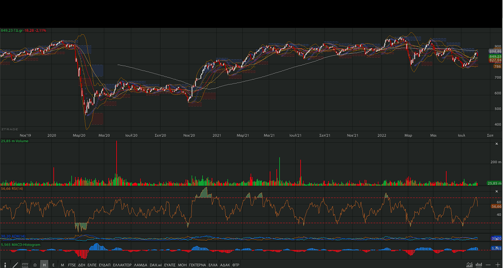 κρίσιμη ζώνη στηρίξεων στα επίπεδα των 850 – 840 μονάδων.