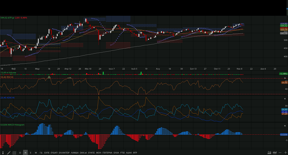 δείκτης έκλεισε χθες στις 594,52 μονάδες (-0,48%), με στόχο