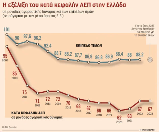 2023 στο 67% του μέσου όρου της Ε.Ε.27, όσο ήταν δηλαδή και