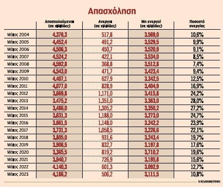 Σήμερα, με αντίστοιχο ποσοστό ανεργίας, μετράει 4,186 εκατ.