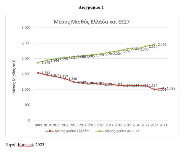 1.038 ευρώ (μεικτά) κατά το 2023 στην Ελλάδα