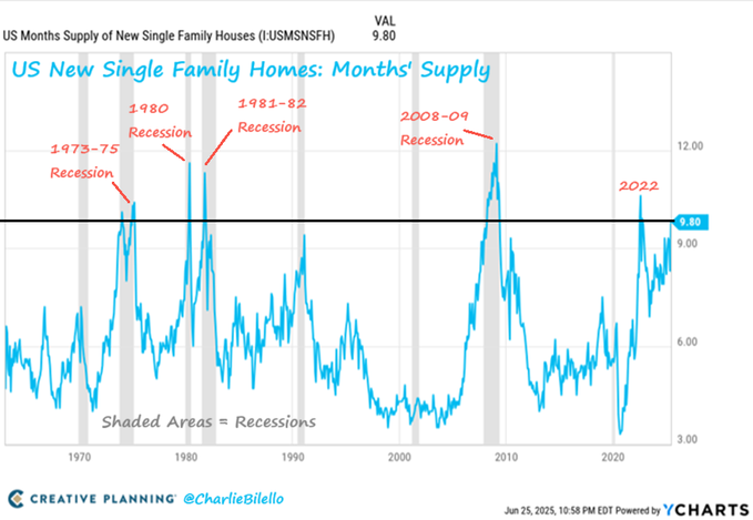 The supply of new homes in the US moved up to 9.8 months in May, highest since 2022. Prior to 2022, when supply was this high the US economy was always in recession & facing job losses. Today, the supply spike (thus far) is due to the least affordable housing market in history.