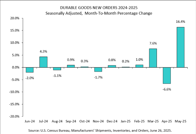 We saw quite a big build in durable orders during May, which came in at 16.4% vs a forecast of just 8.5%