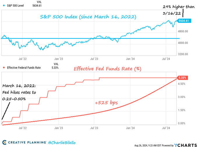 The S&P 500 is now 29% higher than where it was when the Fed started hiking rates in March 2022