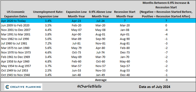 The US Unemployment Rate is now 0.9% above the cycle low from April 2023 (3.4%). Historically, a recession has started on average 3 months before that 0.9% move higher in the Unemployment Rate. Are we entering a recession or is this time different?
