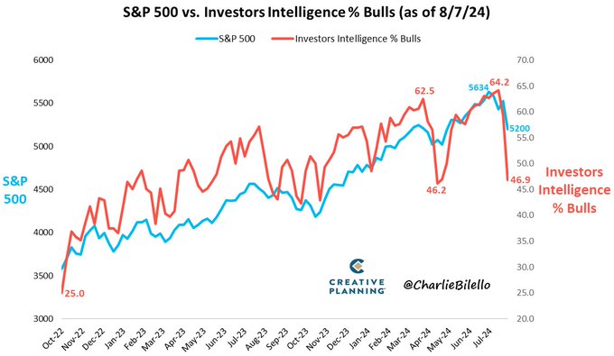 The % of Bulls in the Investors Intelligence Sentiment Index moved down over 17% in the past 2 weeks (from 64.2% to 46.9%). That's the biggest 2-week % drop in Bulls since the October 1987 crash