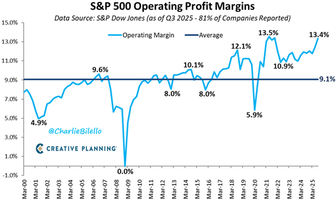 S&P 500 operating profit margins expanded to 13.4% in Q3, their 2nd highest level on record