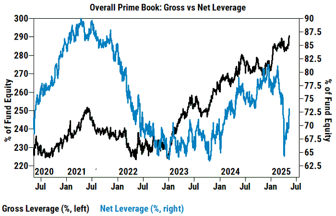 Hedge fund gross leverage is very elevated, but net leverage remains quite low. This tells us that their books are still lopsided to the short side.