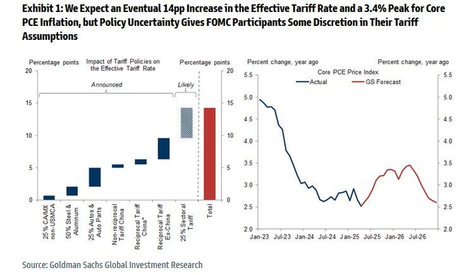 Goldman sees PCE peaking out at 3.4% before ultimately falling as a result of the short-term impact that tariffs have on the rate of price changes. More reasons for the Fed not to cut yet