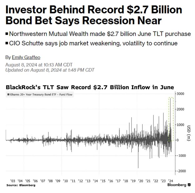 Northwestern Mutual invested $2.7 billion in TLT during June in a bet that a recession is coming soon. That was the largest monthly inflow to TLT in history!