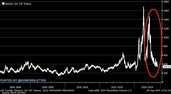 Lumber prices have declined to their lowest level since the 2020 pandemic, down 80% in 2 years.