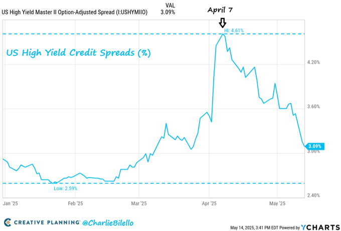 During a huge risk-on advance, US High yield spreads have tightened 152 bps since April 7. With spreads now at 309 bps above Treasuries, credit market investors are back to pricing in a very optimistic outlook with no recession and few defaults