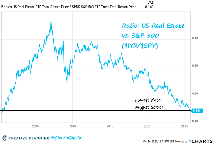 The Ratio of Real Estate stocks to the S&P 500 has moved down to the lowest level since August 2000.