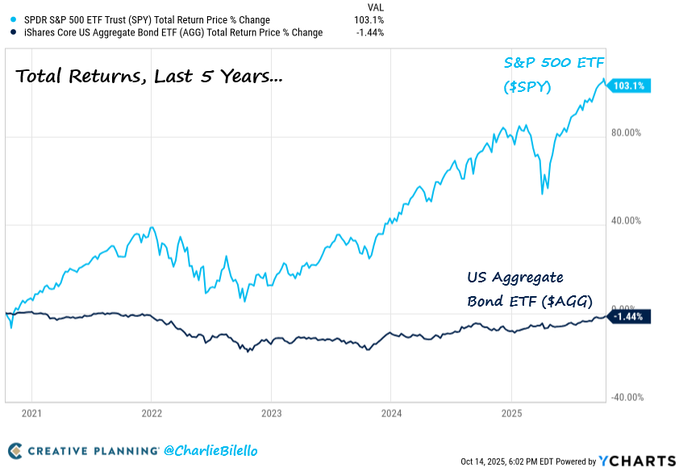 US stocks have more than doubled over the past 5 years while US bonds are down 1%