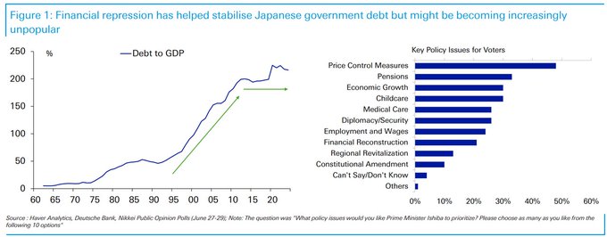 Financial repression has helped to stabilize Japanese government debt, but may be becoming more unpopular as prices move higher and growth lags
