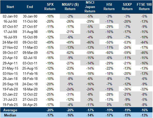 We're all connected: "Broadly, all equity markets tend to fall when the US experiences a correction above 10%", Goldman says.