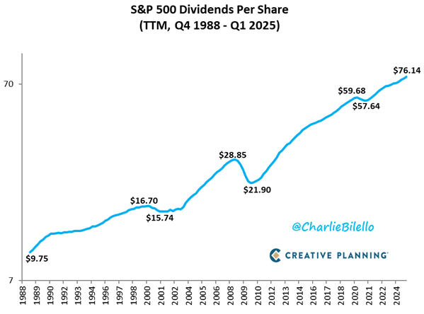 S&P 500 TTM Dividends hit another record high in the 1st quarter of 2025, up 7.5% YoY. This was the 15th consecutive quarter with YoY increases