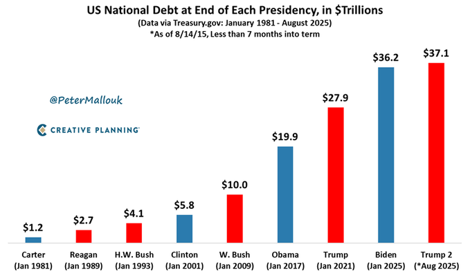 Red or Blue, the national debt goes up. The only thing both parties can agree on is sending the bill to future generations. Next stop: $38 trillion
