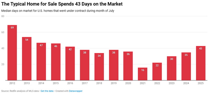 The average US home sold in July spent 43 days on the market, the longest since 2015.