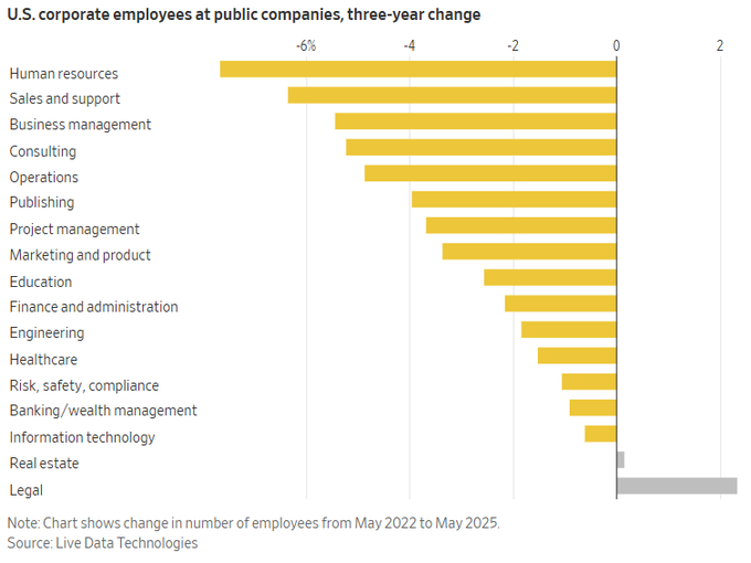 20% of companies in the S&P 500 have fewer employees today than a decade ago, including McDonald's, General Motors, Procter & Gamble, Bank of America, and Walmart