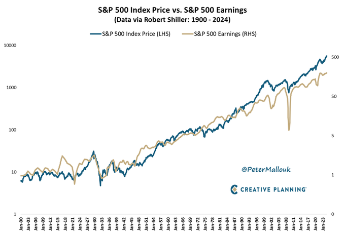 Over the long run, earnings grow and stock prices follow the earnings, just not taking the exact same path. It really is that simple. Ignore the noise.