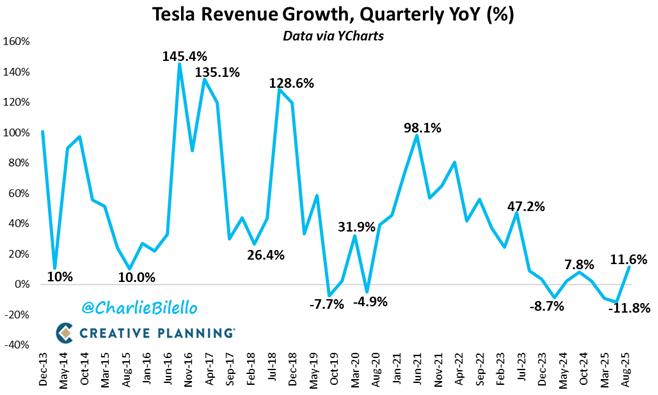 Tesla revenues hit a record $28 billion in Q3, rising 12% over the last year. That was the highest revenue growth number for the company since Q2 2023. Net Income came in below expectations at $1.37 billion, a 37% decline from a year ago. The profit drop was driven by lower EV