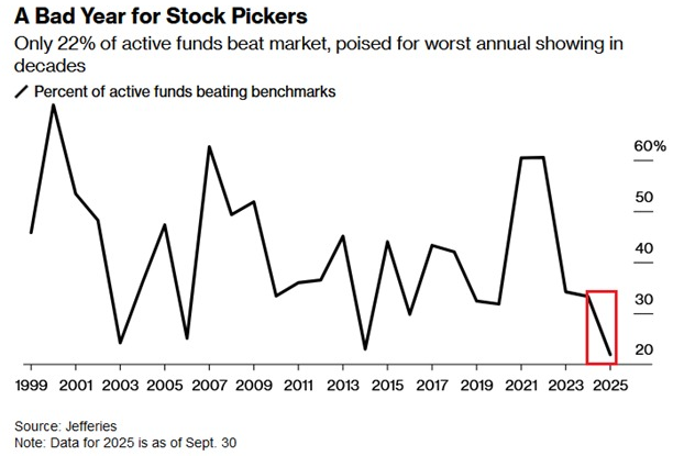 Only 22% of active funds have beaten the market YTD, the worst performance in at least 26 years.