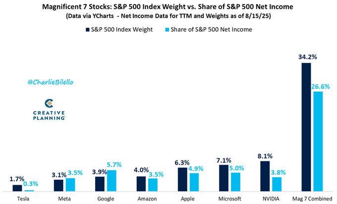The Magnificent 7 make up a record 34.2% of the S&P 500's market cap ... but just 26.6% of its profits.