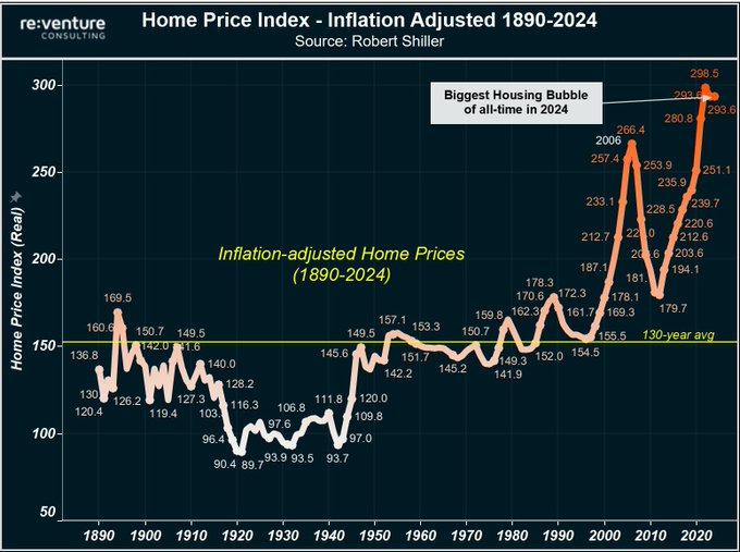 Inflation adjusted home prices are now a near record 100% higher than the long-term 130 year average, according to Reventure.