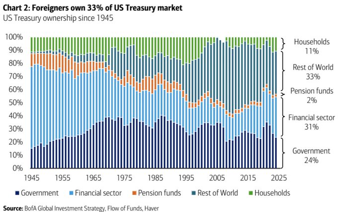Foreigners own 33% of the US Treasury Market - this was published by BofA on 10 April 2025.