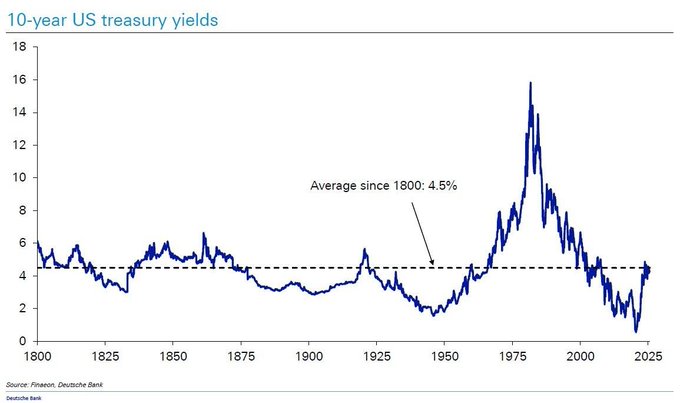 The average yield for 10-year Treasury notes has been 4.5% since 1800. Perhaps that's one reason why markets tend to get a bit skiddish when we push above there. Particularly with some velocity